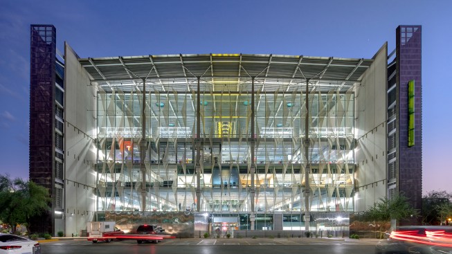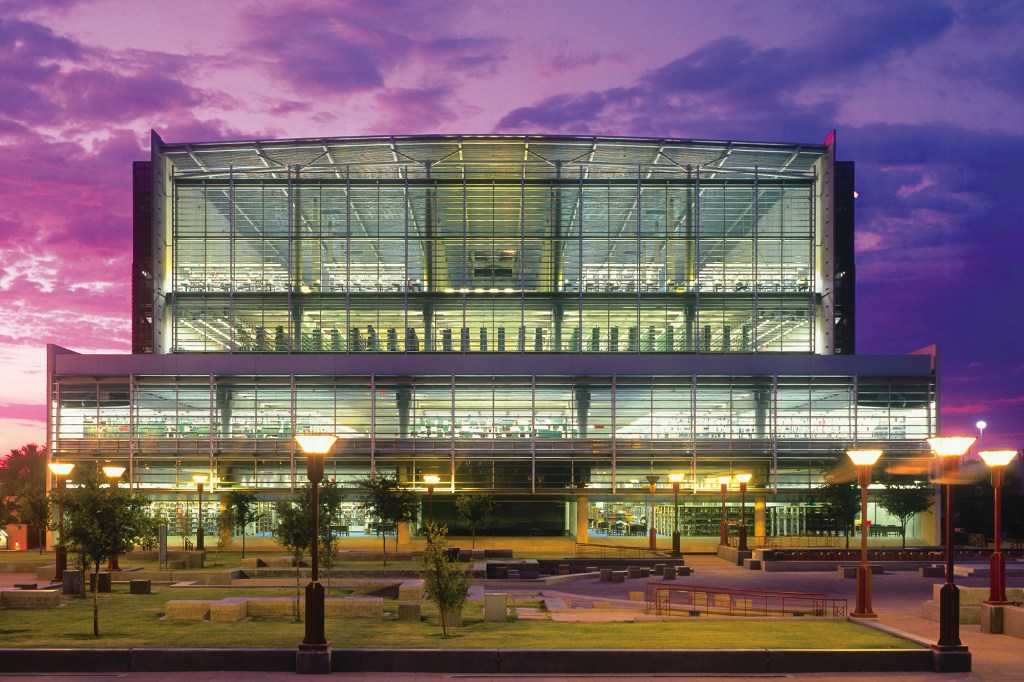 BruderDWLarchitects completed the 280,000-square-foot project in 1995, housing the library’s 1 million–volume collection within a sculptural, weathered copper–clad exterior inspired by Arizona’s flat-topped mesas. Patrons can enter the five-story library through one of two entrances that feed into a 90-foot-tall skylight atrium. Glass elevators and a translucent staircase carry visitors to each of the five floors.