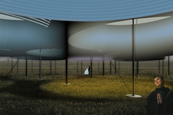 The winning project, dubbed “Oculi,” features a series of elevated circular structures made of deconstructed metal grain bins, a structure that is widely found abandoned in the rural landscape of the northeastern United States. Each structure offers a wide oculus to the sky and each opening “tracks the path of the sun, producing a range of shadow patterns augmented by color and sound,” according to a release. The interior walls will be painted to resemble the colors of the daytime sky.
