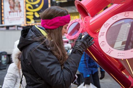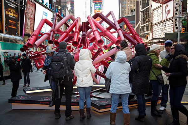 This week, Brooklyn’s Young Projects installed their “Match-Maker” heart sculpture in Times Square. The cluster of red and pink periscopes are bookended with zodiac signs, so visitors can match themselves to other astrologically-compatible mates.