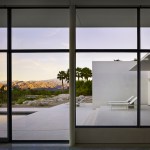 To answer the particular concerns for the Palm Springs site, the architects created two offset, linear building masses and combined the living and dining rooms into an elongated rectangle that provides a place for the multimedia triptych painting along a stretch of whitewashed wall behind the dining table. Both volumes are finished in vast expanses of floor-to-ceiling glass, but “there appears to be much more glass than there actually is,” says principal Joseph King. “The transparency is geared toward the views, so where there are none, there is actually a lot of solid capacity.”