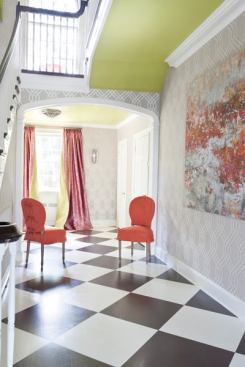 Jim Rill, AIA, and David Benton, AIA, of Bethesda, Md.–based Rill Architects selected to paint the front door and entry bright blue, which Bethesda-based Camille Saum contrasted with lime green on the ceiling of the foyer and interior stairwell. Saum selected the green (she referred to it as chartreuse) based on a color in the 3D-beaded wallpaper from The Romo Group. “This is what I’m known for—how I do color,” Saum said at a press preview on Tuesday.