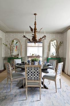 D.C.’s Marika Meyer emphasized indestructibility in the dining room, because it’s the only formal eating place in the roughly 8,000 square foot house. She used indoor/outdoor fabrics on the chairs and a distressed table.