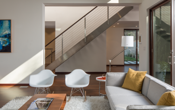 The home’s three modules were built in its Vallejo factory, prepared for shipping, delivered, and craned onto the foundation. Once the pieces were set, the floor frame was bolted to the foundation at specific structural load points and the modules were seamlessly connected at wall sections. This well-engineered approach represents a new way of thinking about how homes are designed and delivered, says Haney.