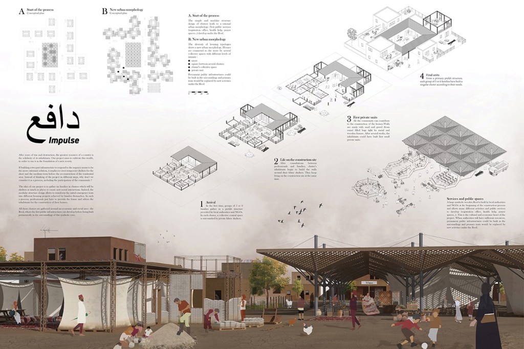 A proposal from the team of Alexandre Houdet, Valentine Aguiar, Antonin Belot, and Hans Fritsch—who hail from Nantes, France—has won the Archstorming‘s Mosul Postwar Camp international design competition. Titled “Impulse,” the winning project highlights the importance of a participatory approach in rebuilding community resilience in postwar reconstruction.