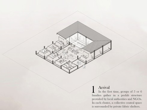 The winning project features a modular, incremental housing concept. The recently unveiled proposal envisions a new urban morphology that is shaped by a series of housing clusters organized around communal spaces. Each cluster will house five to six families, who will gradually transform their dwelling space from a basic emergency tent to a one- or two-story permanent housing unit, according to their needs. To minimize the overall costs, the team also proposed reusing salvaged construction materials found in the ruins. According to the proposal, upon arrival to Mosul, each family will be provided with an emergency tent and a permanent structural frame: a base for each unit’s future expansion.