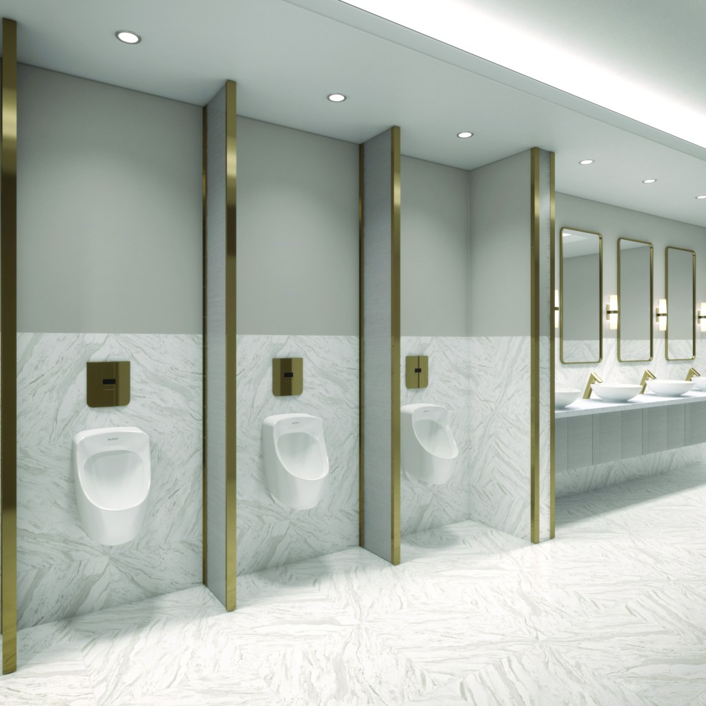 Commercial restroom manufacturers are developing unified product collections with fixtures that work together from faucets, soap dispensers, flushometers, hand dryers, and more to create one cohesive experience. These products are similarly patterned to deliver unified design and often are available in special finish options to create a matching color palette that brings a level of high design to the restroom.