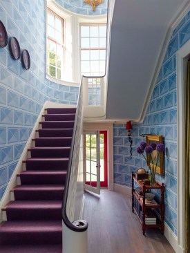 This is really coming from Katie, and I really think it makes the house special. The purples and the mulberry and the yellow and the green. I think that it enhances the architecture, but these are not colors that I would have been able to dream up, ever. … And also, the house is quite sober-looking on the outside, so it helps that it has red window sashes and a blue metal roof on the porch because it kind of gives you a clue that this kind of sober house has a very colorful inner life.