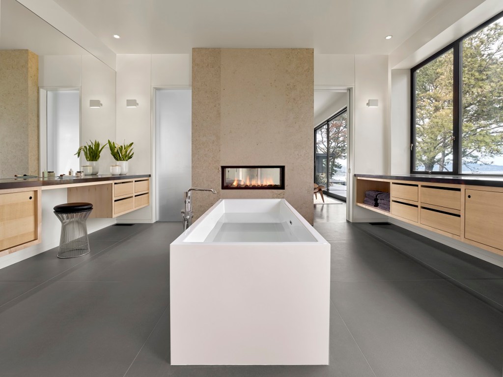“The fireplace became an anchor point between the master bedroom and the master bath,” says Bernstein. “The natural character of the stone felt right against the strong geometry of the architecture.”