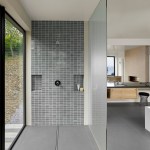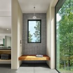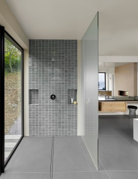 Both walls in the shower area are outfitted from the floor to the ceiling with small-scale, ceramic tile with a blue-gray glaze. According to Bernstein, the perception of the tile’s hue shifts depending on the color of the sky.