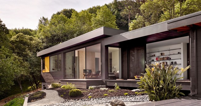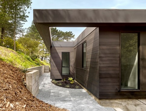 For a master suite addition to their home overlooking the San Francisco Bay, architect Cary Bernstein’s clients visualized a modern, spa-like retreat connected to the outdoors and immersed in nature. They honed in on four primal elements—earth, water, air, and fire—for the new space located on the eastern side of the single-story, mid-century modern house on a wooded 2-acre lot.