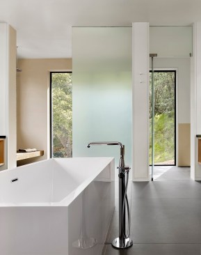 Thanks to the site’s sloping lot and densely clustered trees that ensure privacy, the design team was able to incorporate floor-to-ceiling windows in the shower and water closet areas to further open the space to the outdoors.