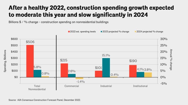 Factoring in all these trends, the AIA Consensus Construction Forecast Panel is projecting spending on nonresidential buildings to increase almost 6% in 2023, down from the almost 10% growth in 2022. Next year, growth is projected to slow to under 1%. Much of the anticipated growth this year will come from the industrial sector, while next year the institutional sector will provide most of the meager growth that is expected.