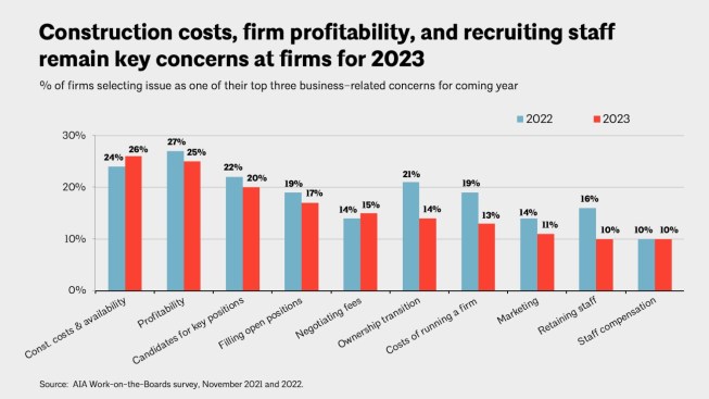 - Tighter project management: Given the uncertainty surrounding materials costs and availability, architecture firms often have had a difficult time designing projects within the client’s budget. Per AIA’s Work-on-the-Boards survey, more than a quarter of architecture firms ranked coping with volatile construction/building materials costs and availability as one of their top concerns (out of three) entering 2023. While this issue seems to be resolving itself as the economy cools, firms have been largely helpless in dealing with this problem over the past two years, and therefore are wary that it may re-emerge in the future.