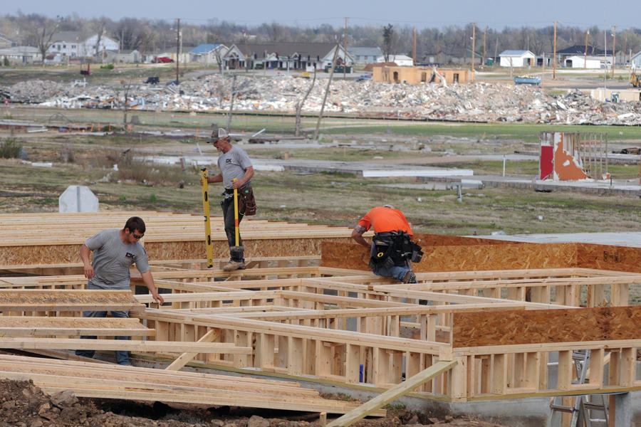 Mark Rohr, Joplin’s city manager, says that Joplin is on track. Taking care of all of the debris in Joplin had put building efforts on hold, but the massive cleanup of over 3 million cubic yards of residential matter was completed in 68 days in order to meet funding deadlines. The next priority was to open the schools on time on Aug. 17. Only after those tasks were completed could residential rebuilding begin, Rohr says. By February, nine months after the tornado, 55 percent of the homes damaged were under permit for repair or rebuilding.