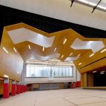 Exeter Schools Multipurpose Space – Exeter, Missouri The challenge was to design a single space that functions as a cafeteria, practice gym and performance hall for a rural K-12 school district on a budget. The solution is a simple steel frame structure inserted into an existing courtyard with an outer layer of tectum and an inner layer of perforated wood panels.