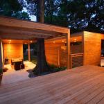 Swamp Hut – Newton, Massachusetts The Swamp Hut is designed to sit lightly upon the land. Four huts surround a central deck creating a protective enclosure. Each building component has distinct characteristics appropriate to its use.