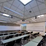 Lighting loads were kept low as common skylights and acoustical ceiling tiles are combined in a sloped system designed to wash the spaces with diffused daylight and eliminate the need for electric lights during the day. Automated controls dim lights in response to daylight levels, and occupancy sensors turn off lighting when spaces are not in use. The classrooms and commons are bordered by large panes of frosted glass that allow light to pass through while minimizing visual distraction.