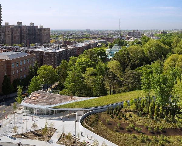 Incised into a berm that separates the 52-acre Brooklyn Botanic Garden from its parking lot, this visitor center (with its store, ticketing, exhibition, and event space) creates a new entry point to the campus along bustling Washington Avenue. A pleated copper roof atop the glazed volume at the street transitions to a lush green roof that the botanists use as a living laboratory for native plant species. The jury called the project “simple and exquisite,” noting that “it is a ribbon of a building, integrating roof, pedestrian experience, and city context.”