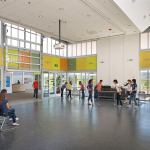 Seminar rooms, spaces between classrooms (called studios) and teacher offices are clustered in neighborhoods and operable partitions in all core learning areas provide flexibility. Durable, low-toxicity, low-maintenance materials include polished concrete floors, steel framing, steel roof and floor decking, and fiber-cement siding.