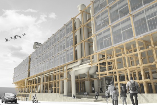 This scheme would transform an existing parking lot at Université Laval in Quebec City, Canada, into a 300,000-square-foot collaboration hub for the schools of architecture, design, urban planning, and visual arts.
