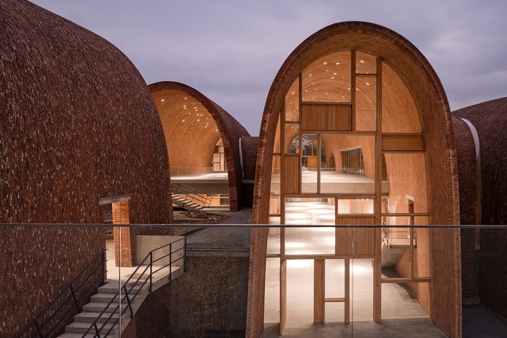 The ceramic ceiling unfolds towards the welcome desk and curved glass façade outside with the adjacent tower beyond.