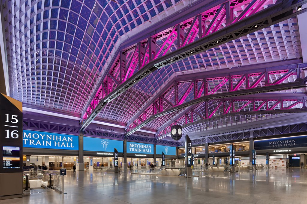 “The lighting design plays a key role in the architectural enhancement of this space. The view from the outside shows the lighting as a bold and graphic statement, while a closeup view shows the depth and gradation of the curved coves.” —Juror Joyce Hahn, Arup, Los Angeles