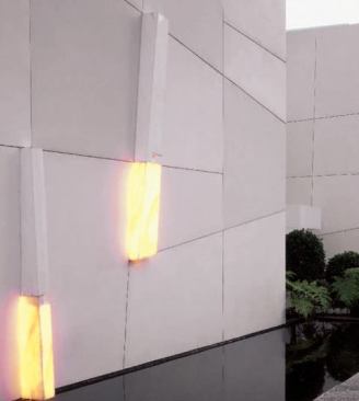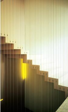 The main entry is distinguished by a band of translucent marble on three sides, like an abstracted doorframe, head, and jamb. With great drama the moment of arrival is celebrated. During the day sunlight illuminates the marble band, while at night 70W metal halide lamps seek to emulate the same light quality (right).