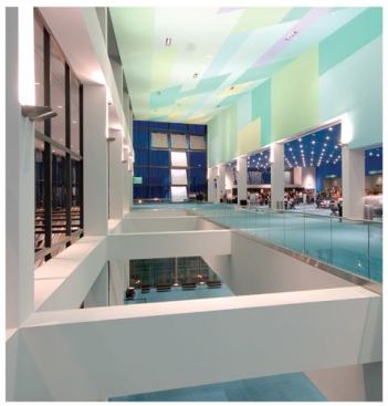 As the circulation spine turns the corner of the building, the colorful interior graphics, all in cool tones, continue in an abstracted homage to the Ohio River and are lit with a combination of T8 fluorescent cove fixtures and 150W T6 metal halide washlights. The ceiling is highlighted by 150W T6 metal halide uplights. One of the challenges for the lighting design team was the “consistency of effect and source color match” because “the architectural conditions varied causing 10- to 40-foot setbacks.” Simple yet effective, the billboard-like quality of this three-dimensional illuminated façade creates an entirely new feature for the Cincinnati skyline. A|L