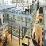 In keeping with the theme of “lightness” the new structure sits off the existing building’s ground plane via a series of steel beams. For the lighting, only one source is used—solid-state lighting. Working with Stuttgart luminaire manufacturer Nimbus Design, the architects designed square LED modules, which are integrated throughout the project under the glass floors of each level of the new structure. The glass floors allow light to transmit from one level to the next (see image gallery). Over 160,000 LEDs used on the project, chosen in part for their lower energy consumption, and lower heat generation, as compared to traditional lamp sources. Although extremely luminous, glare is prevented by way of “400 holes in each module that limit the emission angle to 90 degrees.” All the lighting throughout the project can be dimmed.