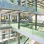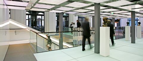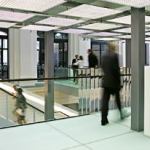 Haus im Haus also relies upon daylight as an illumination source. The upper two levels of the Börsenhalle have arched windows allowing for a generous amount of natural light to enter the hall. Aluminum screens in the new structure capture the daylight and reflect the light into the new spaces. The combination of vertical aluminum fins and horizontal plane of the LED modules embedded in the glass floors creates a dynamic spatial interaction within the new structure itself and between the new structure and its existing surroundings (see image gallery). Exploring the “balance of history and modernity” Haus im Haus transforms the architectural design concept into built reality with the aid of new lighting technologies. The result is a refreshing take on the classic “intervention-in-historic-structure” scenario. A|L