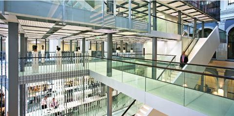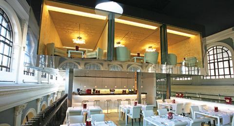 It seems only fitting that Haus im Haus (a house in a house), a project designed to provide new business service facilities for the Hamburg Chamber of Commerce, should be located inside the Börsenhalle, the city’s historic stock exchange building built in 1841 and long-time central meeting place of Hamburg’s business world. Designed by Stuttgart-based Behnisch Architekten, the new, five-story, 15,000-square-foot structure accommodates meeting rooms, workspace for start-up business, private dining rooms, a restaurant, a bar, a lounge, and exhibition space (right).