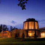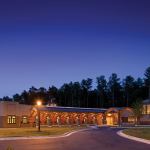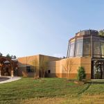 At the corner of the building is the circular library/sitting ro… At the corner of the building is the circular library/sitting room illuminated with the same indirect lighting of the warm natural materials that are used throughout the Center.