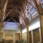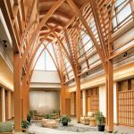 Located at the center of the facility and flanked by the treatme… Located at the center of the facility and flanked by the treatment rooms, a peaked glass and wood covered garden courtyard is a quiet meditation area. Planted with a garden and with a water wall at one end, the courtyard also features the arched wooden truss work seen along the entry loggia and in the circular library. Two different moods can be created for this quiet room. By day dimmable 3000K fluorescent coves located along the perimeter above the treatment room doors give an uplifting feel to the space.