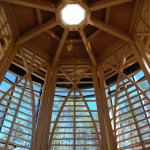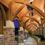 Here, arched wooden trusses overhead suggest a canopy of tree br… Here, arched wooden trusses overhead suggest a canopy of tree branches that filters the sunlight by day. Simulating the sun at the top, fluorescent fixtures located behind a circular diffuser give an ambient glow day and night. Located on the horizontal beams, mono-points with 35W, 3000K, PAR30 metal halide lamps graze up the wood trellis around the room.