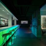 In Salon C the service bar's backlit glass detail is identical t… In Salon C the service bar's backlit glass detail is identical to the entry wall. The bottle shelves are incorporated into the wall. Warm-white LED fixtures fit within the small niche provided and generate minimal heat. A pair of floating gypsum frames flanks the front sitting area.