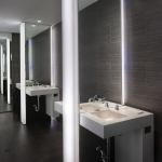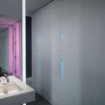 The communal restroom has private stalls and the gender designat… The communal restroom has private stalls and the gender designation for each is reinforced with color. A resin panel, inserted in the door, allows the gender symbol and handle to glow with color.