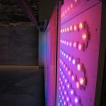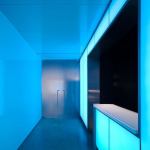 The entry coat check area was fashioned as a portal. The polishe… The entry coat check area was fashioned as a portal. The polished surfaces reflect light for a dramatic entrance. The glass walls are backlit with a series of RGB LED modules. Due to the restricted wall depth of 3 inches, the LED modules are mounted tightly together and can display patterns and low-resolution animation. Concealed track fixtures accent the desk.