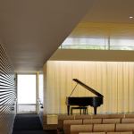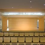 In the meeting space, daylight and electric light were again employed, this time to frame a blond wood “box” that serves as a stage. The room’s ambient light comes from flush-mounted MR16s, installed in an irregular pattern across the ceiling plane. The stage itself is illuminated by a combination of PAR38 tracklights concealed above the ceiling and linear fluorescent coves that wash the back wall. All light sources can be controlled from a simple wall-mounted switch box, giving the congregation the power to light their space as the need demands.