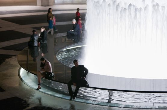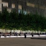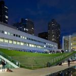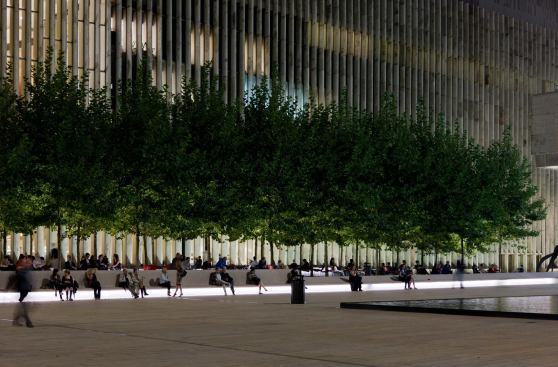 The most striking revision is in front of the Vivian Beaumont Theater, with its Illumination Lawn, a sloping green space that is, in fact, the roof of the building that houses a restaurant, the Film Center, and Lincoln Center’s offices. Here, public space is reinvented, and even more so at night when it is “moonlit” with eight 150W metal halide spotlights located on the roof of a nearby building. As with all of the new interventions, lighting is that extra something that gives the space a heightened sense of drama as staged and unscripted performances play out.