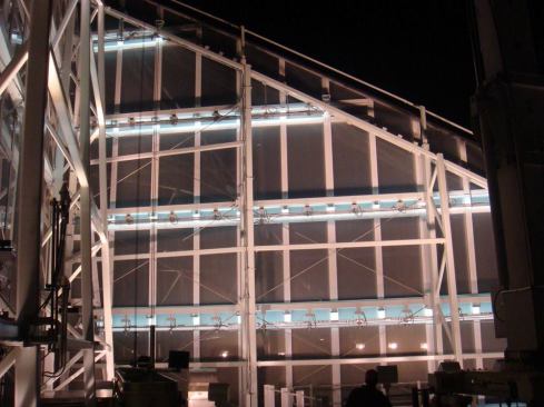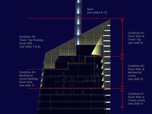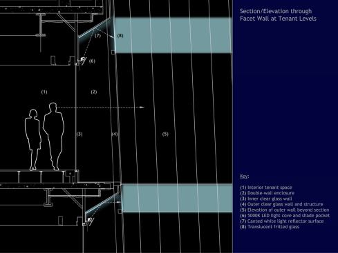 The technical feat of this project is in the lighting designers’ ability to realize the architect’s vision for a glowing building top despite clear glass, minimal structure, a requirement for unobstructed views, and competing illumination from the interior offices. The top of the building—a V-shaped facet wall—had five different architectural conditions, and the lighting designers had to develop a different solution for each one. Color temperature proved the constant in tying them together. Using different techniques—uplighting, floodlighting, and backlighting—with a combination of LED, fluorescent, and metal halide sources, all combined in 3000K and 5000K, the required illumination was achieved.