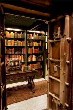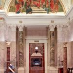 The lighting designers started by replacing the T12 fluorescent channels in the former entrance with two zones of dimmable T8s to illuminate the painted ceiling and wall frescoes. The former director’s office, never before opened to the public, has been converted into a gallery where bookcases are equipped with dimmable fluorescents and LED accent lights for displays. Freestanding cases employ fiber optics for internal illumination and house ALR12 lamps to highlight the painted ceiling.