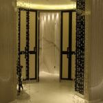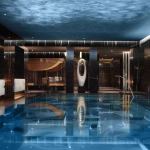 The only daylight comes through a domed glass-and-silver-leaf roof at the juice bar on the first floor. In contrast, the finishes for the spa’s lowest level are almost entirely black. The darkness creates a dramatic setting for the stainless steel swimming pool. The space is lit entirely with LED uplights, embedded either in the floor or in the pool itself, where they shine through the water, creating mesmerizing patterns on the white ceiling.