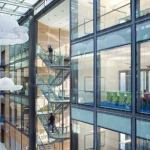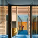 While these two luminaire types shoulder the bulk of the project’s electric lighting scheme, the designers took further measures to emphasize the architecture. LED fixtures accent every third column along the atrium colonnade, both exterior and interior. The designers also used LEDs for the laboratory tasklighting and LED strips to backlight artist-designed glass installations in the office corridors.