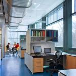 In the labs, the perimeter desks have LED tasklights and uplights that provide general and egress illumination.