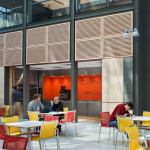 The café serves the internal plaza area. The orange resin panels are washed by lights recessed in the soffit.