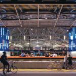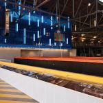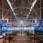 This former biplane hangar is being given a second chance to become airborne in its new incarnation as the House of Air. The 21,440-square-foot trampoline facility is located in San Francisco’s Golden Gate Park on the historic Crissy Field landing strip. The original 1920s structure required extensive seismic upgrades, leaving little remaining budget to deal with any architectural improvements. These economic constraints challenged Mark Horton Architecture to find creative solutions for the lighting as they worked the design into the building’s retrofit. By installing off-the-shelf fluorescent strip fixtures between translucent blue polycarbonate walls, the architects found an inventive and cost-effective solution to light two spaces at once with a limited palette.