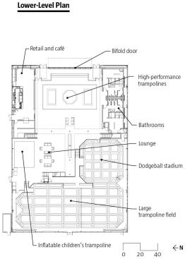 The House of Air capitalizes on the lengthy spans of the hangar to house a large field trampoline, a side trampoline which doubles as a dodge-ball court, and three performance trampolines. The performance trampolines provide a training location for competitive skiers, snowboarders, and wakeboarders to practice their tricks. The facility also contains locker rooms and meeting facilities, as well as a small café and lounge, with structural-steel catwalks providing spectator vantage points.
