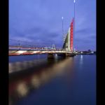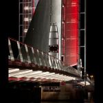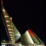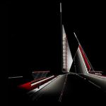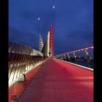 In its closed position, the bridge is illuminated with white light. Metal halide sources uplight the underside of the bridge and its structural ribs. LEDs are integrated into the pedestrian handrail and at the tip of each mast. The lights along the pedestrian zone change from white to red to alert those on the bridge that it’s raising or lowering. Red lights in vertical “totem-like structures” along the bridge begin to flash, and then a wash of red color rolls out like a carpet along the pedestrian path. The animation is perfectly timed thanks to a control system with time clock, photocell, and link to the bridge’s mechanical operating system. With its nod to nautical motifs, the lighting design celebrates the water and the sensation of motion. Jury Comments: A fantastic project • The split of the roadway on the diagonal is extremely clever. • A great use of color to highlight the bridge structure and mast and to produce striking reflections on the water.