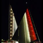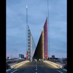The lighting was designed under the direction of Jonathan Speirs, and key to the project brief was the mandate to create a nighttime icon, one that would create an experience for driver, pedestrian, cyclist, and mariner alike. At the heart of that experience is a bridge that transforms into a sail-like structure. The middle segment—the asphalt roadway and metal-grate pedestrian walkway—pivots open and is cut on the bias. As the leaves raise up to full vertical, the two segments stand in opposition and it appears as if two sailboats are passing.
