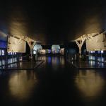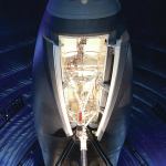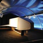 Visitors can walk underneath the shuttle, adding to the thrill of the exhibit. The landing gear wheel wells are highlighted with 3500K 20W ceramic metal halide lamps, which reveal the shuttle’s mechanical inner workings. Because there are no surfaces in the tent from which to support luminaires, Focus Lighting designed eight custom light towers for the fixtures that were used to illuminate the Enterprise’s exterior. Cantilevering 29 feet above the exhibit floor and outfitted with multiple 70W PAR30 metal halide accent lights fitted with 30-degree snoots, the light is thrown 20 feet to dramatic effect, bringing the shuttle to life.
